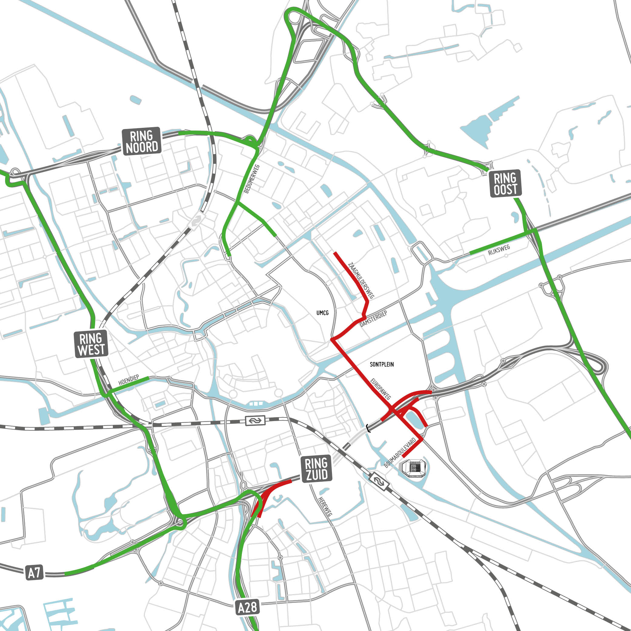 Richting het UMCG adviseren we verkeer om via de Bedumerweg te rijden.